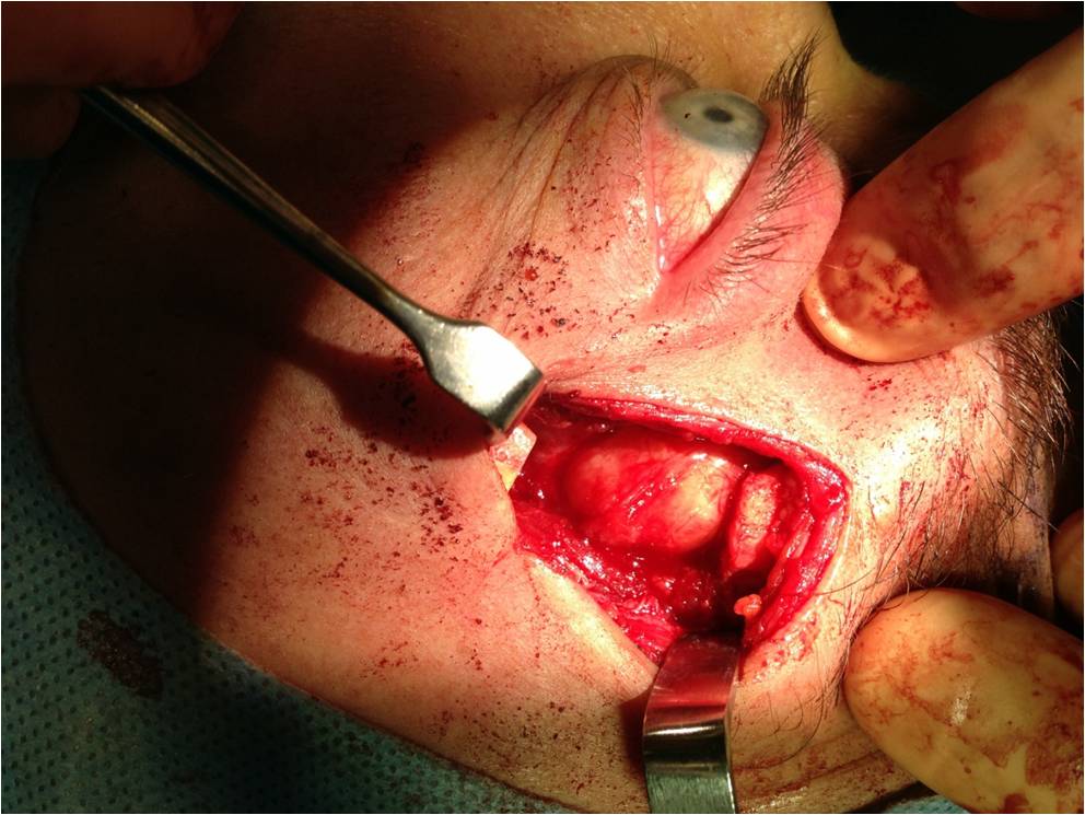Curative treatment of PALG is complete excision with an intact pseudocapsule. In order to achieve complete excision of a lacrimal fossa tumor, a lateral orbitotomy approach is required. This surgery is performed under general anesthesia. Surgical techniques vary, but generally, the following steps are performed: a curvilinear incision (Stallard-Wright) is made over the lateral orbital wall (frontal and zygomatic bones). Temporalis fossa is exposed using periosteal elevators. The periorbital is elevated from the lateral wall and roof of the orbit with a malleable retractor. The lateral orbital rim is cut in two places using an oscillating bone saw. The lateral orbital rim is then outfractured using a large double-action Luer or Bull-nose rongeur. Using a combination of blunt and sharp dissection, the lacrimal gland is mobilized onto an island of free periorbita. Care is taken to avoid the levator and lateral rectus muscles. The gland should not be touched with forceps, always using digits or malleable retractors to mobilize it. Eventually the mass can be freed from the surrounding tissue with the pseudocapsule intact(see figure 8). [5],[12]