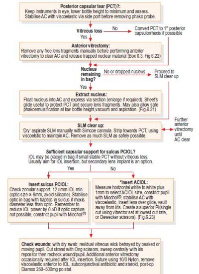 | Dropped Nucleus | Clear the anterior segment of vitreous, perform good cortical clean up, put IOL in the primary setting as described previously, do not fish the dropped lens matter, suture the wound; Refer to Vitreo-Retinal surgeon |