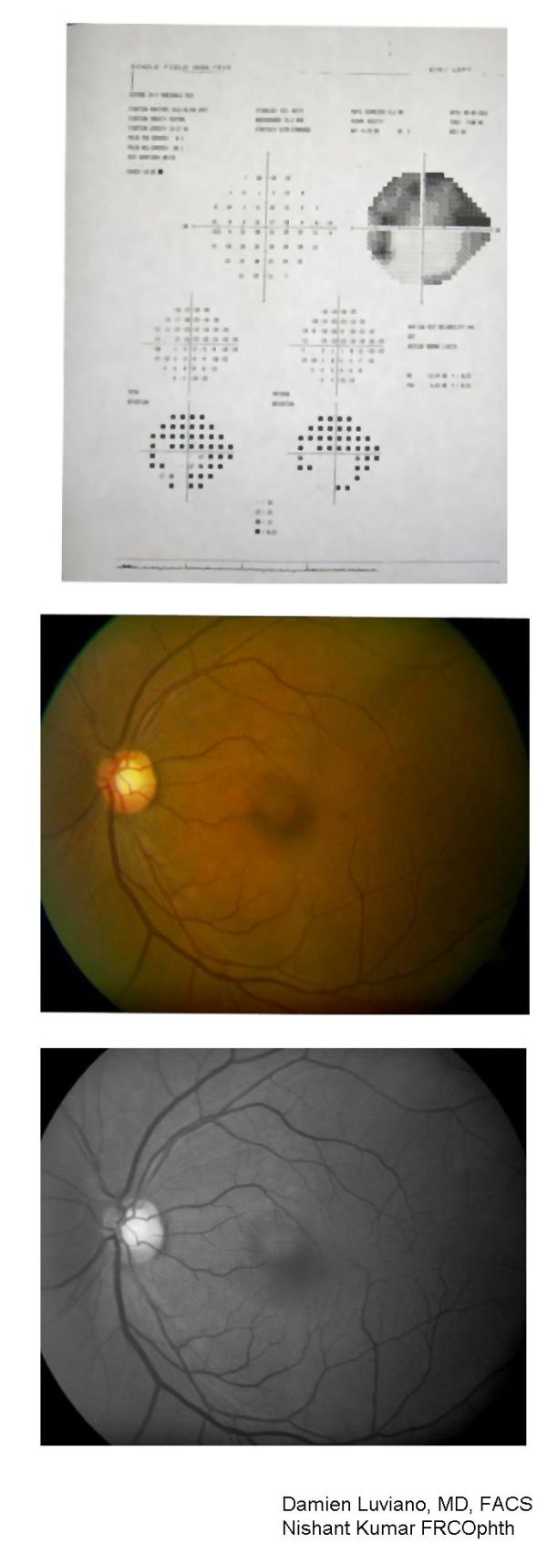 There are often no ocular abnormalities with the exception of RAPD in asymmetric PION cases. By ophthalmoscopy and fluorescein fundus angiography, there is a normal optic disc initially, but temporal optic disc pallor is common 6-8 weeks later [3] [1]. Absence of cup in the optic disc is not seen in the frequency with which it is present in AION [1]. Visual acuity ranges from normal to no light perception. In non-arteritic PION, acuity ranges from 20/25 or better in 17% of patients, 20/40 or better in 20%, and 20/200 or worse in 69% [17]. Central visual field defects are most common in both arteritic and non-arteritic PION cases [1]. However, they may also present with altitudinal defects. No alternative etiology for any ocular, orbital, or neurological findings should be found that could potentially explain patients’ vision loss in order to diagnose PION [1]. No disc edema will be present initially but over time optic atrophy develops in the affected eye.