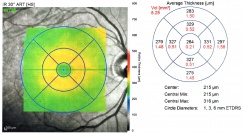 OCT can demonstrate fluid accumulation in papilledema. It can also show the presence of vitreous traction on the optic nerve. Drusen will appear as hyporeflective masses with hyperreflective borders on EDI-OCT, and there are some suggestions that EDI-OCT might be the most sensitive testing modality for optic disc drusen. Small hyperreflective bands have been seen on OCT and are believed to represent nascent optic disc drusen.[14] In pseudopapilledema, an OCT may show a “lumpy-bumpy” internal contour while in true papilledema the internal contour is smooth. OCT in papilledema can show thickening of the peripapillary retinal nerve fiber layer and thinning of the macular ganglion cell complex.[15] Peripapillary hyper-reflective ovoid mass-like structure (PHOMS) can sometimes be observed in patients with pseudopapilledema, however PHOMS may also be seen in a wide variety of conditions (including papilledema).