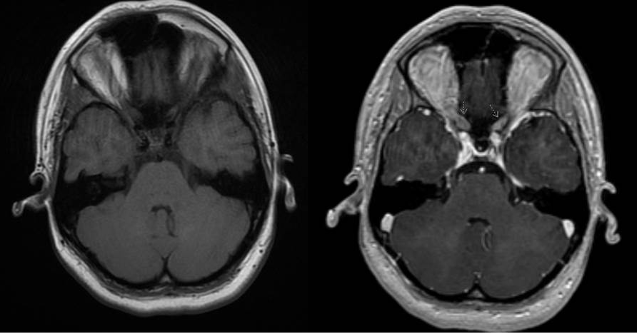 An MRI of the Brain and orbit with and without contrast as well as fat suppression can enhance the involved optic. However, as the image through the optic chiasm may be limited to one slice, pathology may be overlooked.[2] Therefore, it is important to specify that small cuts3T (3mm or less) are needed. Additionally, early on MRI cannot differentiate RON from a recurrent tumor.[4] Communicating the clinical presentation to the radiology specialist may yield to a more efficient location of the pathology.