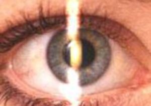 Retinoscopy determines a patient’s refractive error by establishing what corrective lens places the far point of the eye at infinity. Infinity is simulated at the peephole of the retinoscope where all light beams reflecting from the patient’s eye are gathered. The far point is the point where light from the retinoscope focuses after reflecting off the retina. It is defined as the point in space that is conjugate with the retina in a non-accommodating eye.[5] When the far point is located behind the retinoscope or behind the retina, no change in the direction of light will be observed, creating a “with motion” reflex. When the far point is located between the retinoscope and the patient’s eye, this point acts as a fulcrum, creating an “against motion” reflex. When the far point is in the plane of the retinoscope, neutrality is observed with no motion of the reflex.[6]
