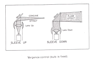 The sleeve lies below the optical head and controls both meridian (or streak rotation) and vergence (or streak focus).[7] By sliding the sleeve up or down, the distance between the bulb and lens is changed to either converge or diverge the light streak. Different sleeve positions are utilized based on the type of retinoscopy technique used. Rotating the sleeve rotates the orientation of the streak around different meridians.