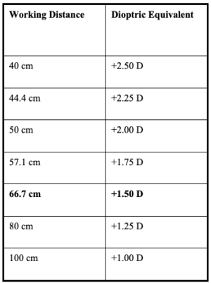 - Determine your working distance. Sit as far back from the patient as possible while still being able to adjust the phoropter or loose lenses. Working distance is calculated by taking the dioptric equivalent of your distance from the patient’s eye.