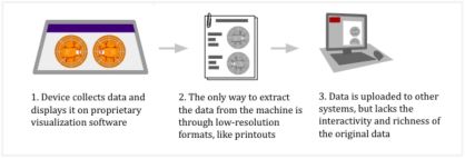 What would a modern, interoperable workflow look like? Imagine being able to sync all of a patient’s data directly on one interface, rather than scattered across several devices and proprietary viewing systems. Imagine never having to export test results as simplified PDFs or printouts ever again, and being able to interact with the original data on any machine. Imagine never having to manually transcribe test results into notes, with your devices communicating directly instead. With the adoption of data standards, this will become possible (Figure 2).