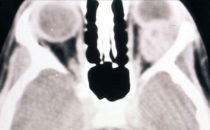 On CT scan (Fig. 3 & 4), the tumors appear as homogenous, well-circumscribed, round to ovoid masses, which are isodense to muscle. They are usually within the orbital soft tissues and do not appear to arise from the extraocular muscles. Earlier tumors do not invade bone, however larger tumors are less well defined and may erode bone and extend into the nasopharynx or sinuses. Areas of focal hemorrhage or necrosis may appear heterogeneous on CT scan. Rhabdomyosarcomas demonstrate moderate to marked contrast enhancement.