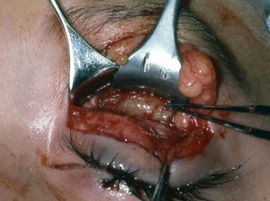 Orbital exenteration was considered the treatment of choice up until the 1960s; however, the mortality rate was roughly 70%. Today, the goal of surgery is to obtain tissue either through an excisional or incisional biopsy (Fig. 1) as described above, to provide pathological confirmation of the diagnosis and histopathologic typing. Frozen sections intraoperatively are difficult to differentiate rhabdomyosarcoma from several other neoplasms and inflammatory processes. If the diagnosis is confirmed, the child should be referred to pediatric oncologists for appropriate management with chemotherapy and possible radiation.