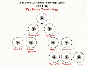 In ocular trauma, injuries can be classified according to the Birmingham Eye Trauma Terminology (BETT) criteria as either closed globe or open globe where an open globe injury is defined as a full-thickness wound. From there, an open globe injury can be described as secondary to blunt trauma or due to a laceration. A ruptured globe is classified as secondary to blunt trauma when an impact from a blunt object results in a momentary increase of the intraocular pressure resulting in an inside-out injury mechanism (i.e. the blunt trauma causes a temporary increase in intraocular pressure, and intraocular pressure forces contents out of the eye with enough force to rupture the eye wall).[1]