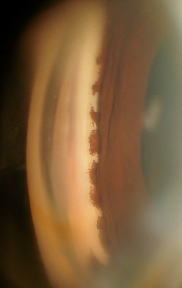 - Trabecular meshwork nodules and/or tent-shaped peripheral anterior synechia.