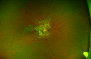 The most common complication of SC is choroidal neovascularization affecting up to 35% of patients. Other reported complications are subretinal fibrosis, cystoid macular edema, branch vein occlusion, serous retinal detachment, optic disc neovascularization ,and anterior uveitis. [9][4]