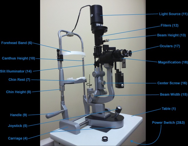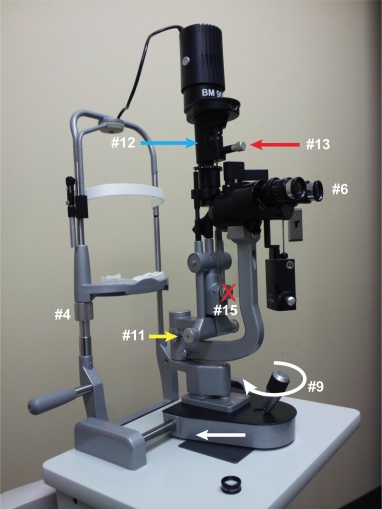 - Routine operation should be conducted with the dominant hand on the joystick (5) and carriage (4) and the nondominant hand on the slit width adjustment knob (15), allowing for fast adjustment of slit beam width as well as manipulation of the angle of the beam by swiveling the illumination arm.
