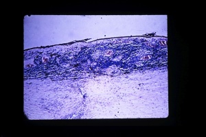 The injured eye is the exciting eye and the fellow eye is known as the sympathizing eye. The primary inlfammatory mediators are thought to be T cells that invade the uveal tract. Studies have shown that an initial wave of infiltrative cells is composed of CD4+ helper T cells[13] and a later wave of CD8+ cytotoxic T cells[14]. Furthermore, in vitro testing has shown proliferative T cell responses to uveal melanocytes in the peripheral blood of patients with sympathetic ophthalmia.[15] The inflammation is usually granulomatous and the choroid is diffusely thickened with lympochytes, nests of epithelioid cells and multinucleated giant cells. The epithelioid cells and giant cells often contain melanin pigment. The inflammatory process does not usually involve the choriocapillaris (in contrast to Voyt-Koyanagi-Harada syndrome) or the retina. Dalen-Fuchs nodules, which are clusters of epithelioid cells containing pigment lying between the RPE and Bruchs membrane, are also seen. Anteriorly, the iris can appear thickened with nodular infiltrations. [16]