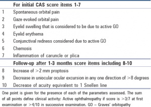 Werner reported the NO SPECS (Nophysical signs or symptoms, Only signs, Soft tissue involvement, Proptosis, Extraocular muscle signs, Corneal involvement, and Sight loss) Classification system in 1969 and a modified version was published in 1977. What is worth noting is that this system grades on disease severity and not the activity of the disease.