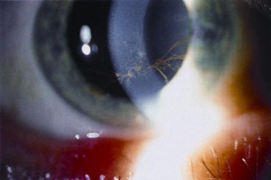- Slit lam examination may show deposits of the drug, sus as Amiodarone. Figure 1. Vortex Keratopathy from Amiodarone crystals deposition. Obtained from AAO.org.