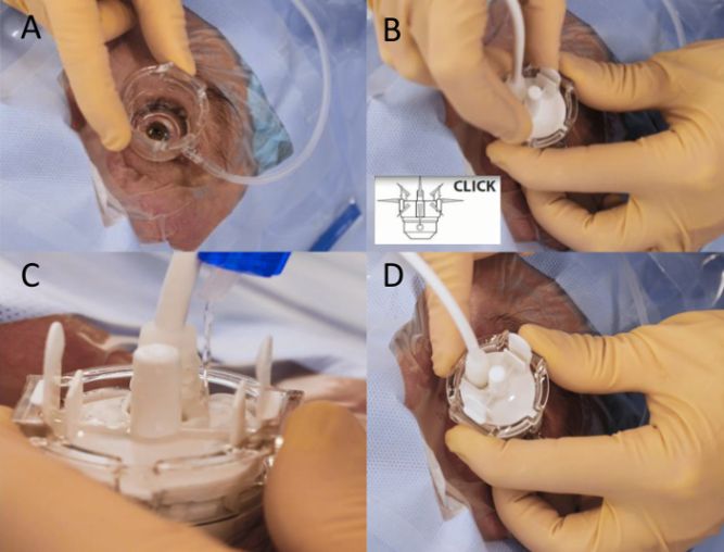 The UCP device has a ring probe that contains 6 piezoelectric transducers delivering ultrasound at 6 different places at different times. The procedure is usually performed in the operating room under peribulbar anesthesia. Figure 1 demonstrates the steps of the procedure. In brief, a coupling cone is first placed over the patient’s eye and maintained in its place by low suction to avoid its rotation during the procedure (Figure 1A). The ultrasound probe is then inserted in the coupling cone (Figure 1B-D). Throughout the whole procedure, the surgeon has to fill the space between the probe, coupling cone, and the patient’s eye with a balanced salt solution to allow proper delivery of the ultrasound waves. Each transducer is activated sequentially delivering ultrasound energy.[1][2]