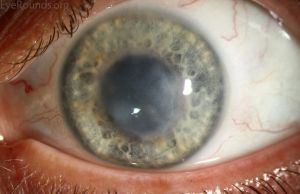 Earliest involvement of the corneal stroma typically occurs after about 10 days, and depending on the region affected can be divided into anterior stromal keratitis and deep stromal keratitis. Anterior stromal keratitis is often observed first during the 2nd week of disease and is often accompanied by nummular infiltrates in the stroma just below the epithelium – these infiltrates are considered to be an immune-mediated response to viral antigens.[15] Without proper treatment, chronic stromal inflammation may result in neovascularization and/or corneal scarring. While uncommon, deep stromal keratitis can manifest several months later.[15]