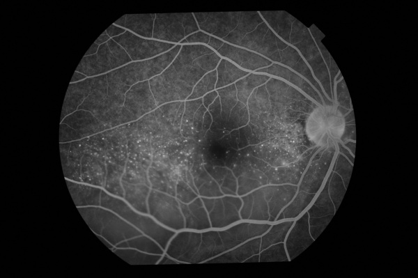 ICG demonstrates an early choroidal stromal vessel hyperfluorescence and hypofluorescent dark spots during the early and midphase, distributed mainly posteriorly, and in excess of those seen clinically on FFA. The late phase will vary according to the current stage of the disease. During the active stage, the hypofluorescent spots fade and are replaced by hyperfluorescent ones (representing focal sites of active choroidal inflammation). In the chronic stage, the hypofluorescent dark spots are seen during all the phases of ICG, but they are unapparent during clinical or FFA evaluation. [12][15]